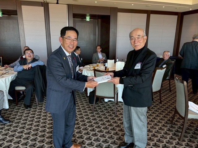 辻邦郎先生の挨拶で始まったパーティーは、歓談や食事を楽しみつつ、参加者全員が近況報告を行いました。近況報告のトップバッターは、若林敬二特任教授でした。続いて、久しぶりに参加の坂下光明さんの話を伺い、その後、テーブル毎に近況報告していただきました。あっという間に2時間が過ぎました。最後にサプライズがありました。2025年4月に静岡市議会議員初当選の木下にお祝いの記念品が辻先生から贈呈されました(写真2)。幹事役の本人が一番ビックリ!皆さん本当にありがとうございました。最後は荻野浩一さんの「万歳三唱」で幕を閉じました。