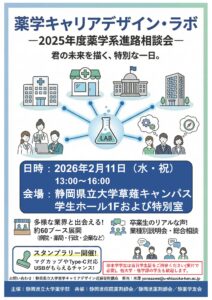 これまで、薬学部と静薬学友会では、病院・薬局・行政機関・製薬企業等、薬学に関連する幅広い団体を募り、2018年度より「薬学系進路相談会」を継続実施し、コロナ禍の影響を受けつつも2023年度まで開催してきました。併せて、薬学キャリアデザイン近藤寄附講座においては卒業生による進路相談会を4年間にわたり実施し、学生のキャリア形成支援を重ねてきました。本年度は、これらの取組を統合し「薬学キャリアデザイン・ラボ」として、病院・薬局・行政機関・製薬企業等との交流を通じ、学生(学部・大学院)が薬学関連業界の最新動向に触れ、主体的にキャリアを描く力を養うことを目的とし開催します。薬学部1年生から6年生、薬学研究院生の皆様はぜひこの機会に各団体の採用担当者や各所で活躍している卒業生のお話を聞きにお集まりください。